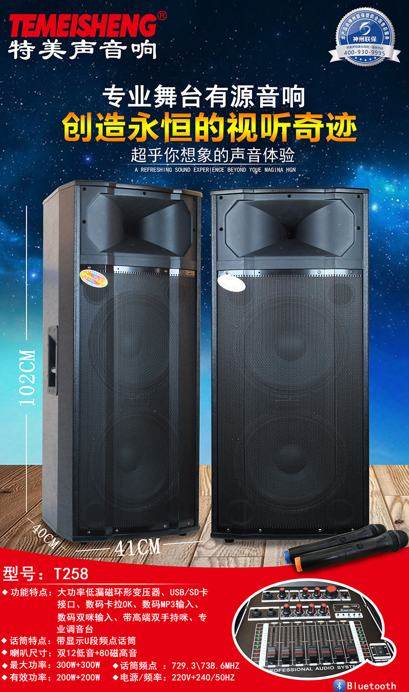 大功率低漏磁环形变压器、USB/SD卡接口、数码卡拉OK、数码MP3输入数码双咪输入、带高端双手持咪、专业调音台